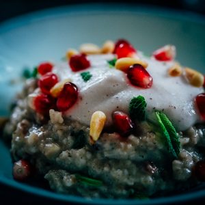 Mit Granatapfelkernen und Minze garnieren.